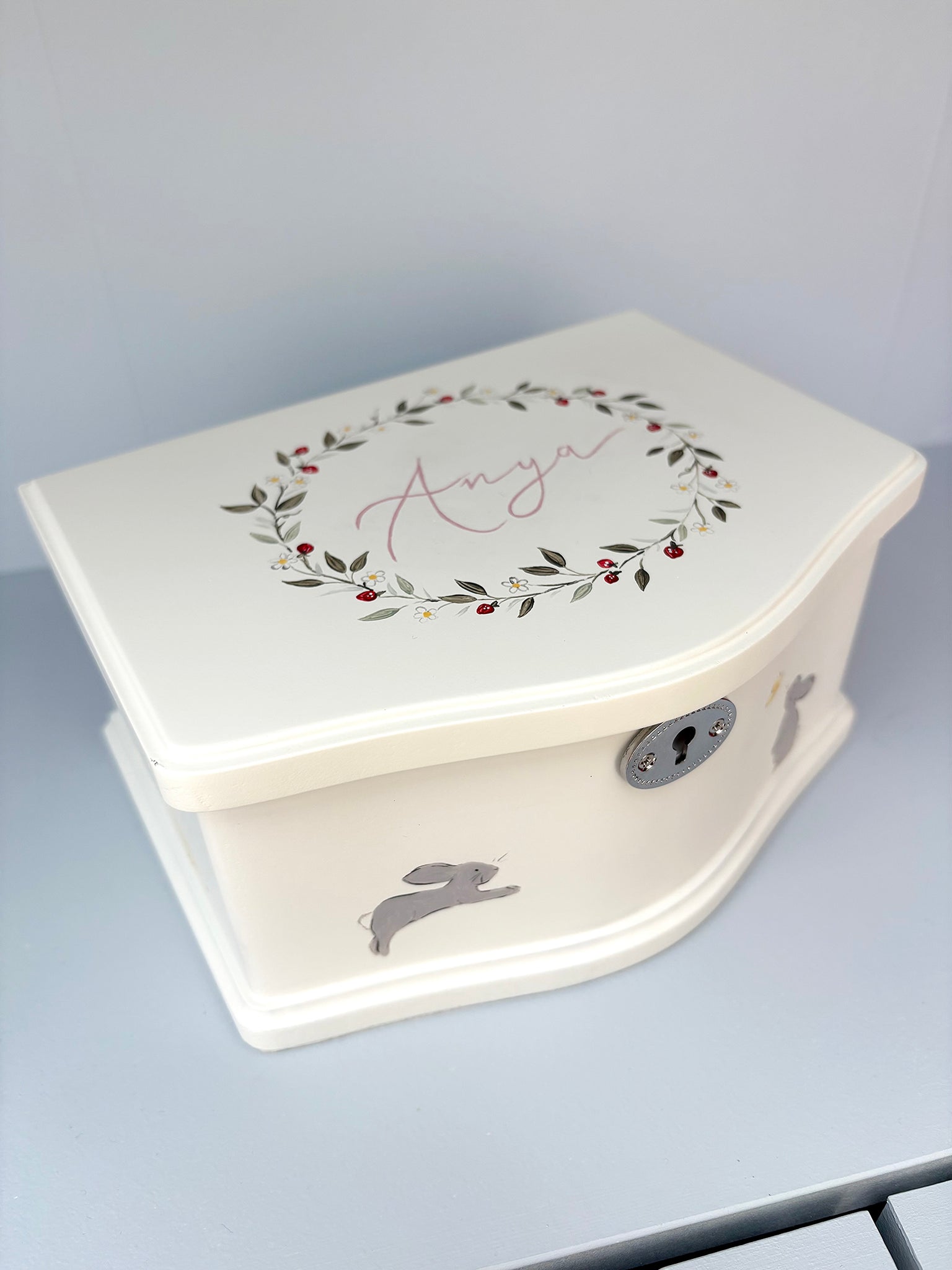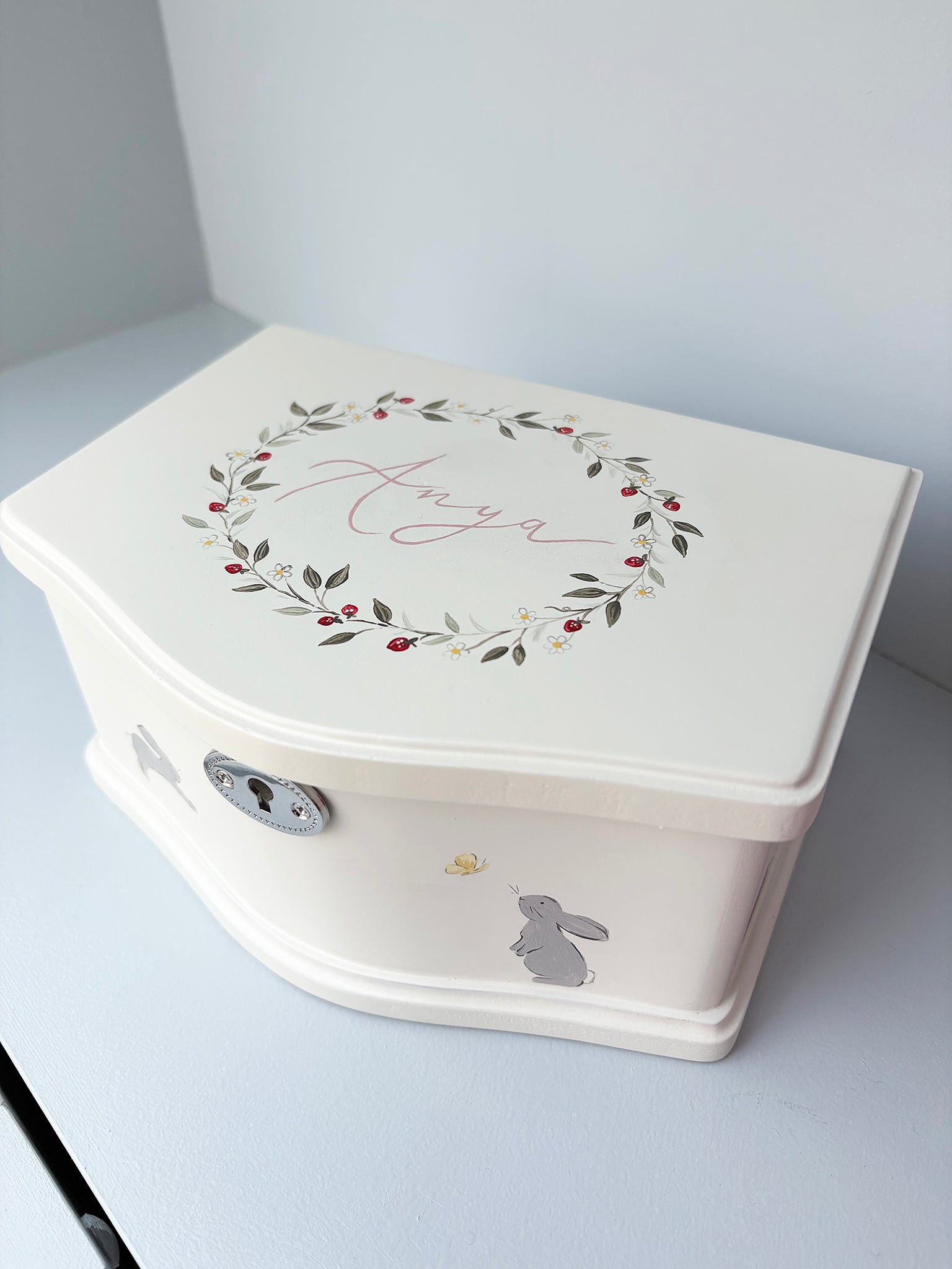 A beautifully hand-painted keepsake jewellery box, personalised with your child’s name and a delicate floral design on the lid. The lid remains dedicated solely to the floral artwork and name, ensuring a timeless and balanced finish.